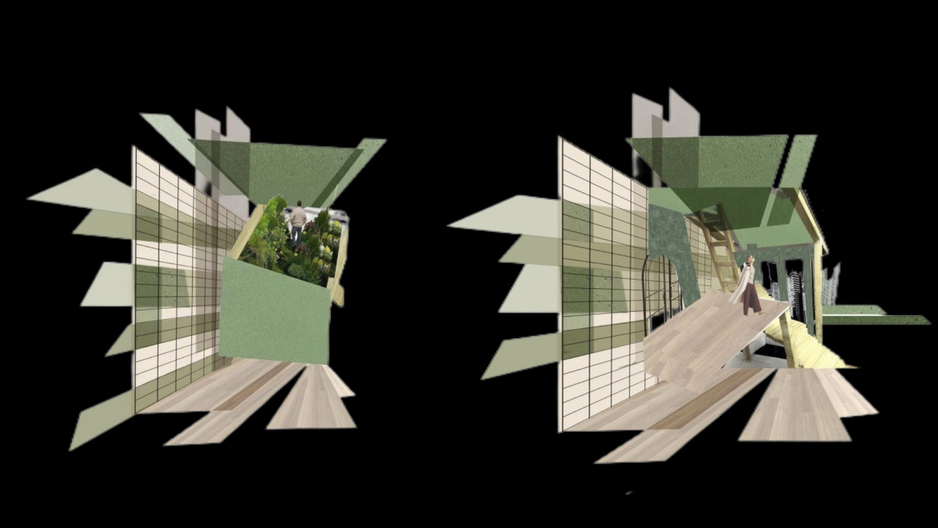 <A sense of distance and belonging> is a pop-up store I designed for Prada. In the overall construction of the building, I referred to some silhouettes and cuts of Prada clothing, established the modelling basis of the building by using angular lines and a large number of triangular bodies, and decided to use Prada’s iconic nylon fabric as the wall texture of the building. At the same time, I designed the building as a semi-open structure, where the transparent glass contrasts with the solid wall, connecting part of the internal and external space, and also bringing a relaxed atmosphere to the customers. The nylon cloth will hide part of the inside display content so as to increase the mystery and attract external visitors to enter the store to explore.