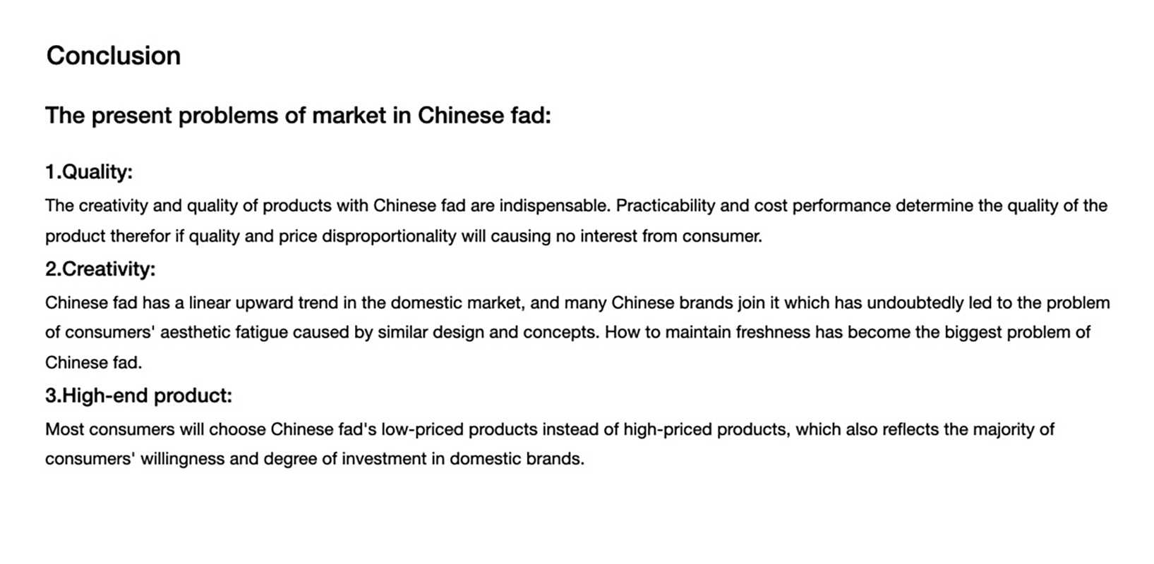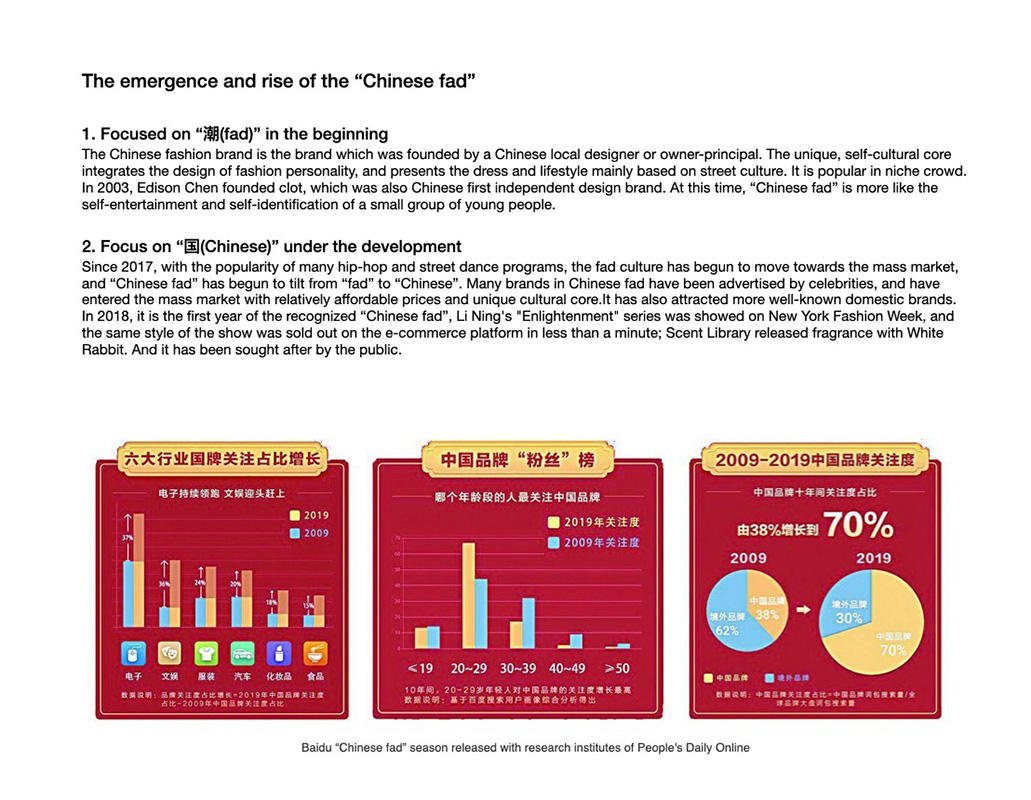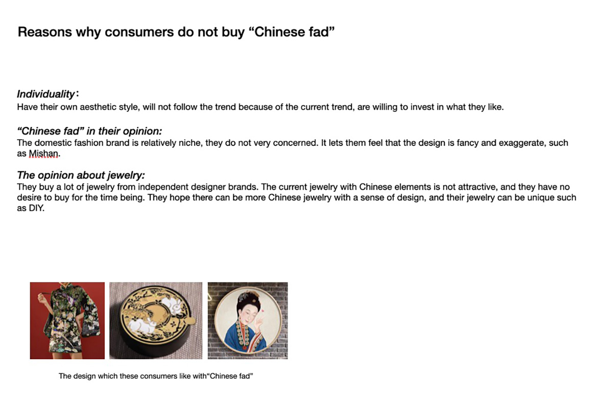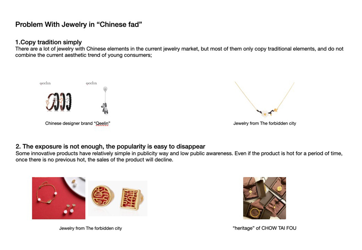 ‘The Chinese fad’, which refers to the most popular trend of the Chinese mainland. In recent years, with the development of the Chinese economy and the rise of traditional culture, the revival of Chinese fad has continued to heat up, and it is widely used in the fast-moving consumer industry, that is, food and beverage, clothing and beauty. For Chinese jewellery brands, how to better integrate into the market of Chinese fad is a very effective direction to try. However, at this stage, the national tide market of Chinese jewellery brands has not yet stabilized, and then it has also ushered in some problems that need to be solved,“low quality”,” copy tradition simply”, ” The exposure is not enough, the popularity is easy to disappear”. So how to improve these problems is the main research direction of this topic.