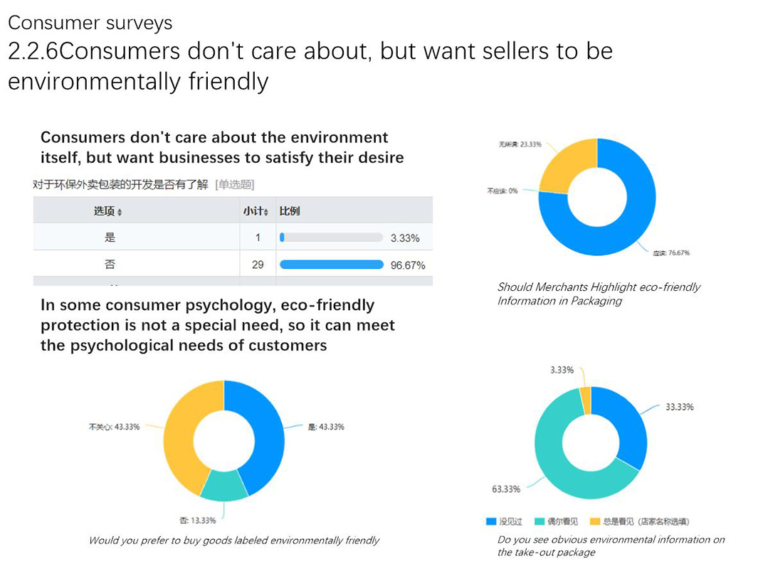 在我的第二個項目中我調研的是外賣包裝的環保問題。城市生活的節奏越來越快,伴隨著外賣行業的需求量激增,環保這個亙古難題一次又一次成為主流話題。早在兩年前,中國兩大外賣公司就推出過環保項目,但是并沒有激起巨大變革。所以我試圖在我的項目中去探討究竟是什么因素阻礙了環保包裝推廣?是材料?是技術?還是人群意識?