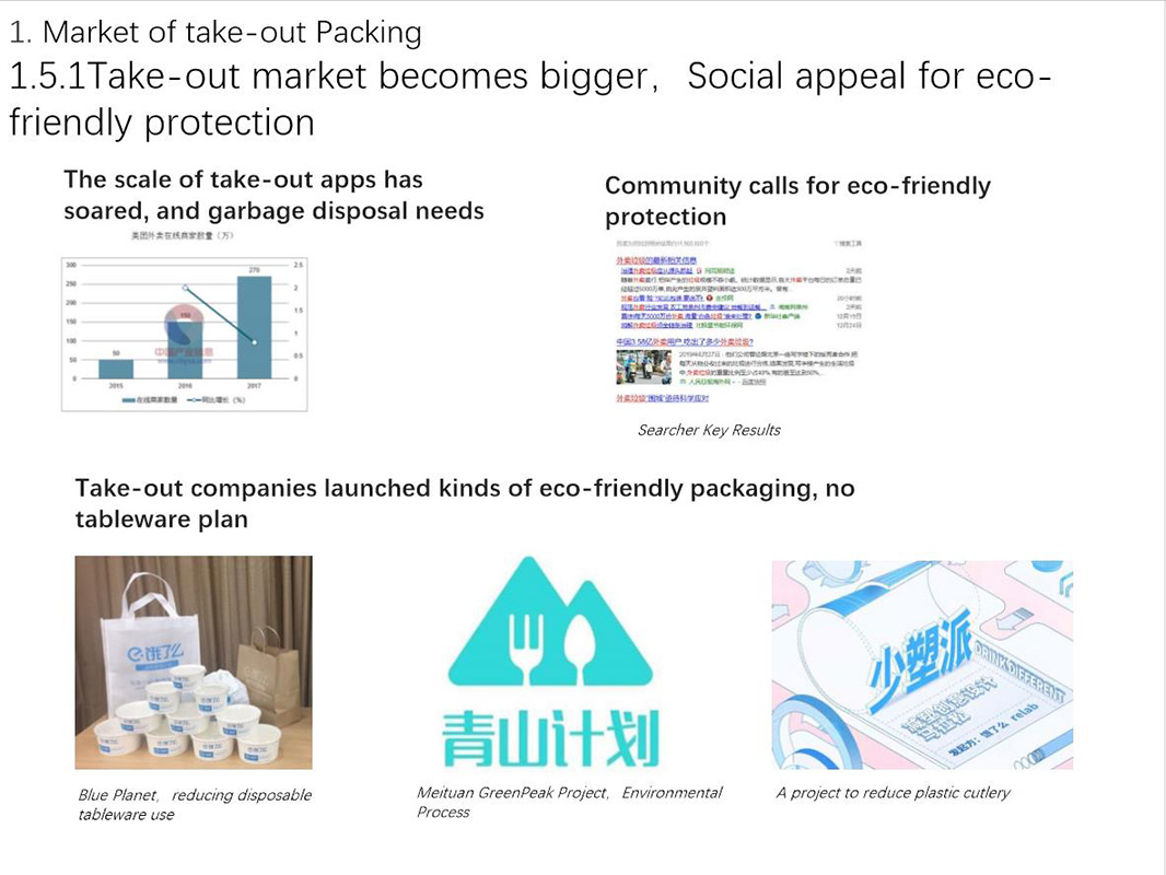 In my second project, I explored the issue about the environment problem of food package. The pace of city life is becoming more and more rapid. With the development in the take-out food industry, ‘eco-friendly products’ has become a heated theme again. Two years ago, two biggest take-out food companies in China launched an environmental project, but they did not spark any big changes. So, I tried to find out what is the main reason that caused the obstruction of the promotion of the eco-friendly packaging. Is it material, technology or awareness?
