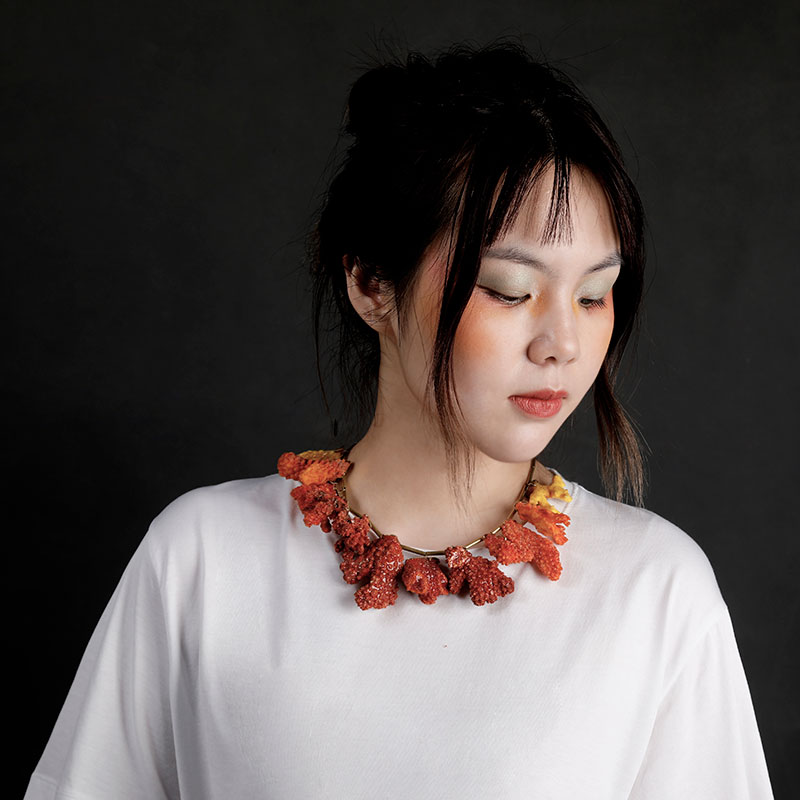 Contemporary jewellery breaks the traditional definition of traditional jewellery by not only using precious metals and diamonds as the main material. Instead, everything can be used as the material of the design. Jewellery design becomes a medium to express the author's own feeling, thoughts and perspectives towards the society through continuous experiments, creation, thinking, and hand making.