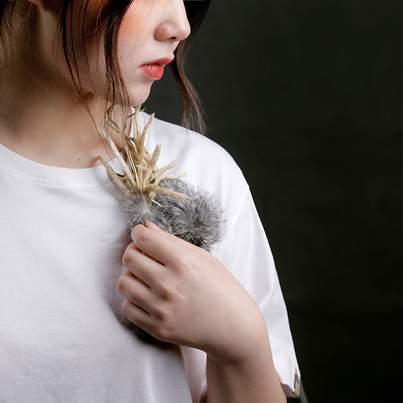 I kept trying to use novel materials in different creation. In my latest creation <Accompany>, I tried to combine the rabbit hair and grass to commemorate the wonderful time that my pet rabbit has brought me. After a great amount of experimental explorations, I finally made four pieces of jewellery, which encouraged the audience to feel the smooth oAf the rabbit fur and delightful fragrance of the grass.