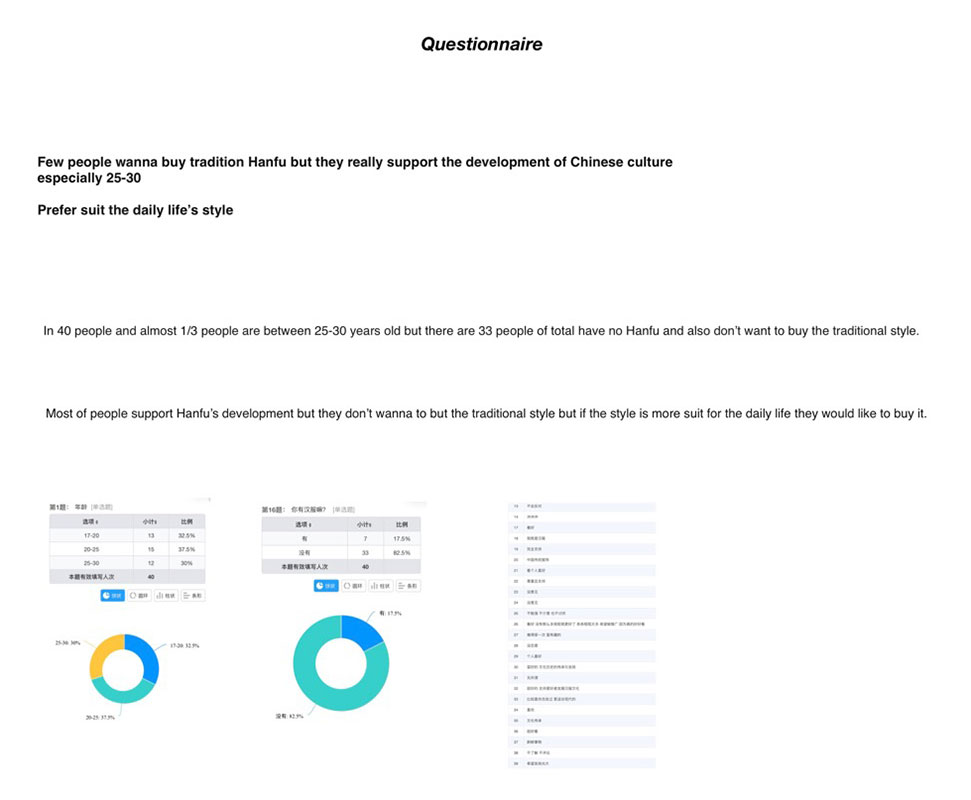 在我的研究中,我主要采用定性分析與定量分析靈活結(jié)合的方式。在<Urban Autism> 和<Constant and changeable ballet shoes>的研究中,我主要采取了定性的研究方式。而在 <The research of Hanfu industry in Chinese market> 的研究中,我主要采取了定量的研究方式。我選擇<The research of Hanfu industry in Chinese market>作為上學(xué)期的主要研究項(xiàng)目主要是因?yàn)闈h服是近年來很火熱的一個(gè)話題。同時(shí),在2019年,李子七的視頻又重新把漢服帶成了全世界最火的話題。