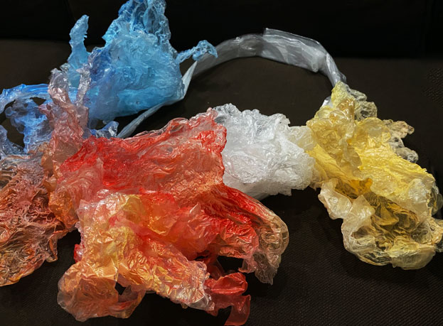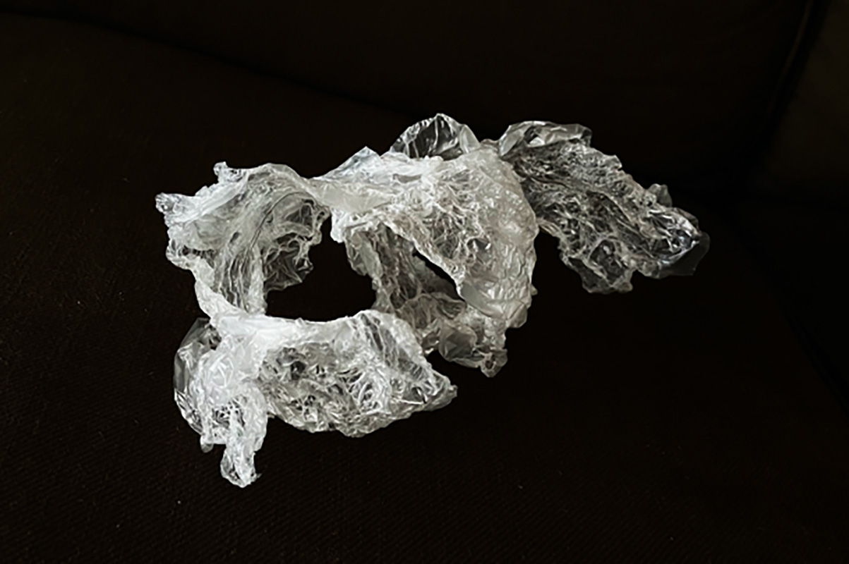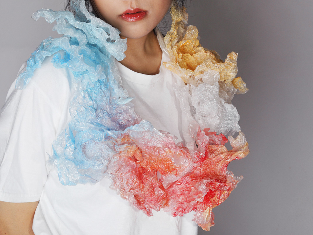 I prefer to use found objects as my materials to make narrative jewelleries. I like to hide a long story behind the jewellery because it gives you a view of the hidden beauty. In the work I made about the love of my grandparents, I used their photos and the red rope as the found materials. In the meantime, I also express my feelings to the audience through jewellery, from the missing to my family to the anxiety about the worsening environmental pollution in my hometown. For example, in the work I did this year, I used plastic bags, which are collected from the seaside as the material to simulate the appearance of marine creatures being entangled by plastic. This jewellery design shows the severity of Marine pollution.