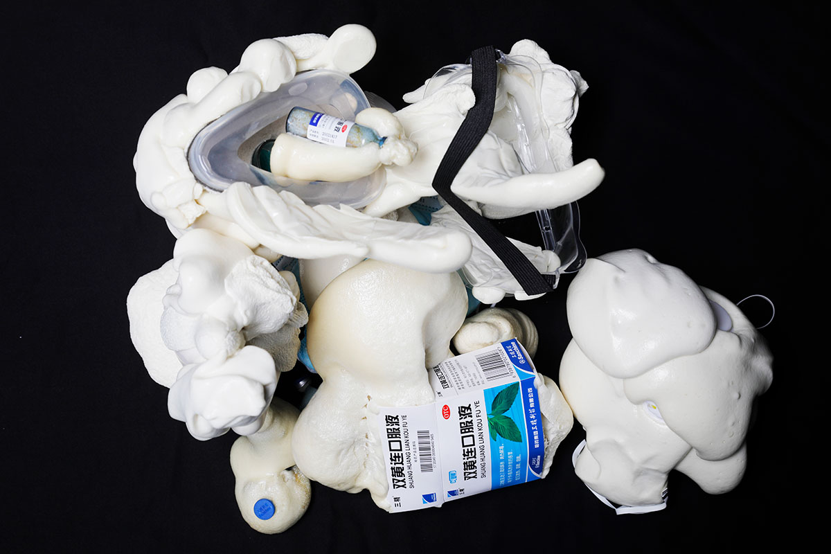 我的藝術實踐是在使用視覺語言來討論一些社會現象或探索。比如在最近的作品《價格》中,討論了疫情期間畸形的不受控制的防疫用品漲價現象。通過夸張的藝術手法來凸顯這些產品的暴力溢價。材料上也基于這個觀點,使用了多種低密度與可膨脹性的泡沫作為材料;并通過染色、發泡、定型、固化等方式使其與防疫用品結合,來得到預期的視覺效果。