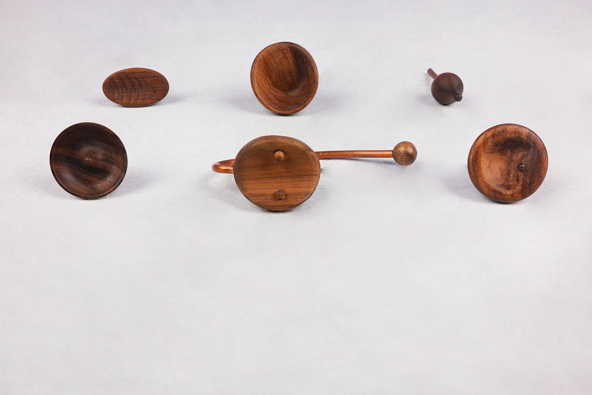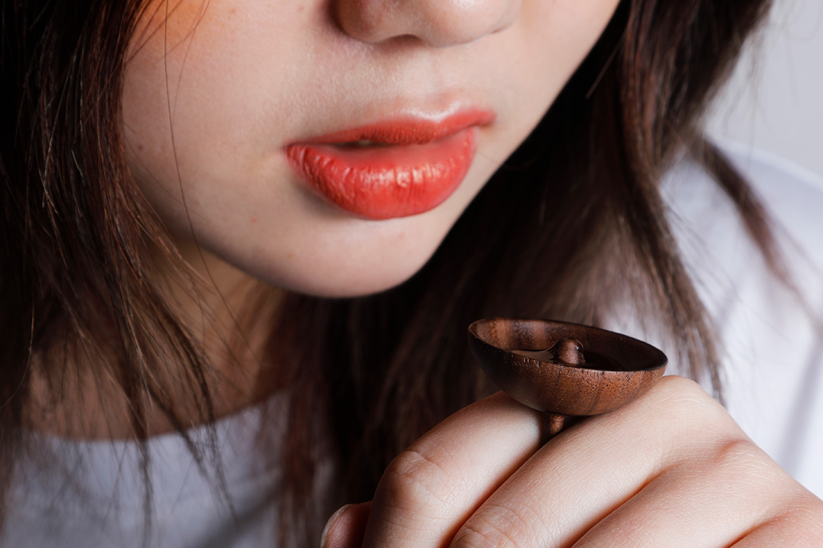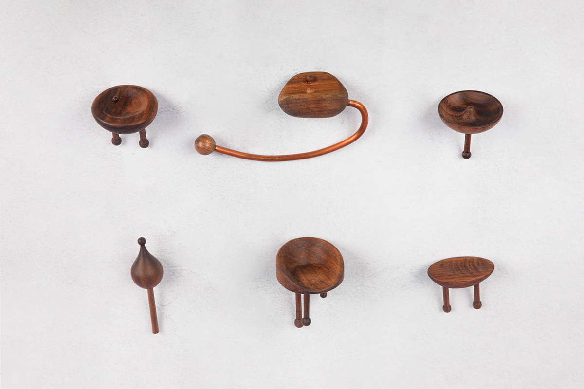 她的作品《感官體驗器》將首飾與餐具結(jié)合拓展了首飾的外延,強調(diào)觀眾的使用過程。她受到“聯(lián)覺”心理現(xiàn)象的啟發(fā),將木材作為感官體驗器的材料。她研究了吃飯時的口腔運動,給觀眾更多的飲食體驗過程。她希望觀眾通過工具與食物溝通,并認識到品嘗食物的重要性。