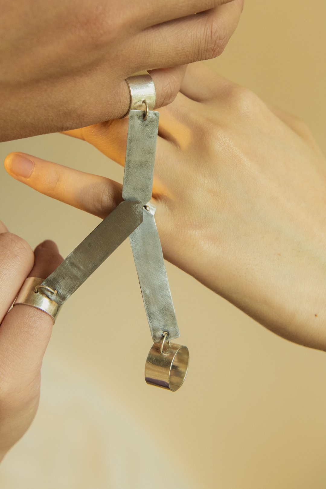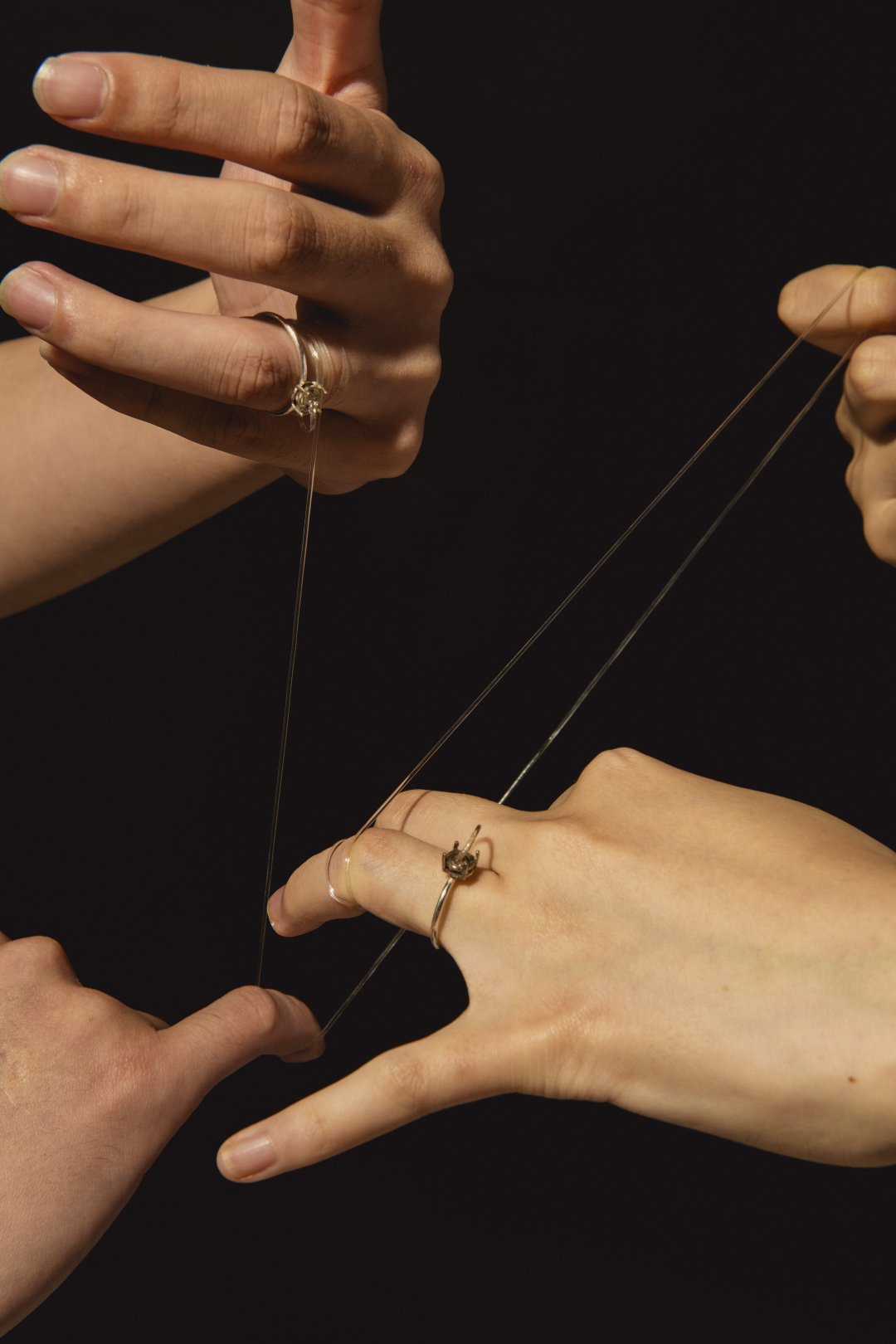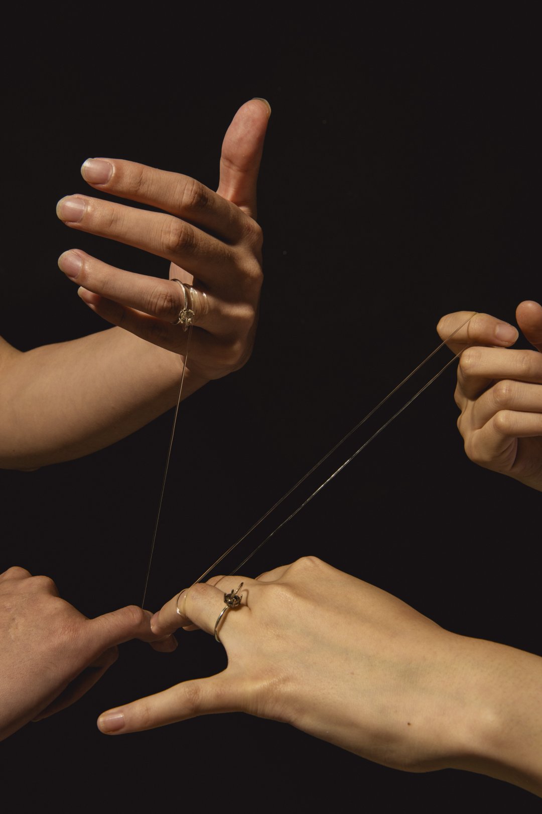 在項目《Wrapping》中我通過視頻展示曾經(jīng)自己追求完美主義的行為,在創(chuàng)作過程中剖析行為的源頭,最終意識到不斷追求遮蓋瑕疵只是虛假的“完美”。項目《Necklace》是首飾和游戲的結(jié)合,以金屬項鏈為線索結(jié)合不同的新材料,與觀眾互動進行探索首飾秘密的游戲。《Interpersonal Rings》 中每一件首飾靈感都來源于特定的事件,用首飾的語言具象化其在人際關(guān)系中帶來無形的影響。