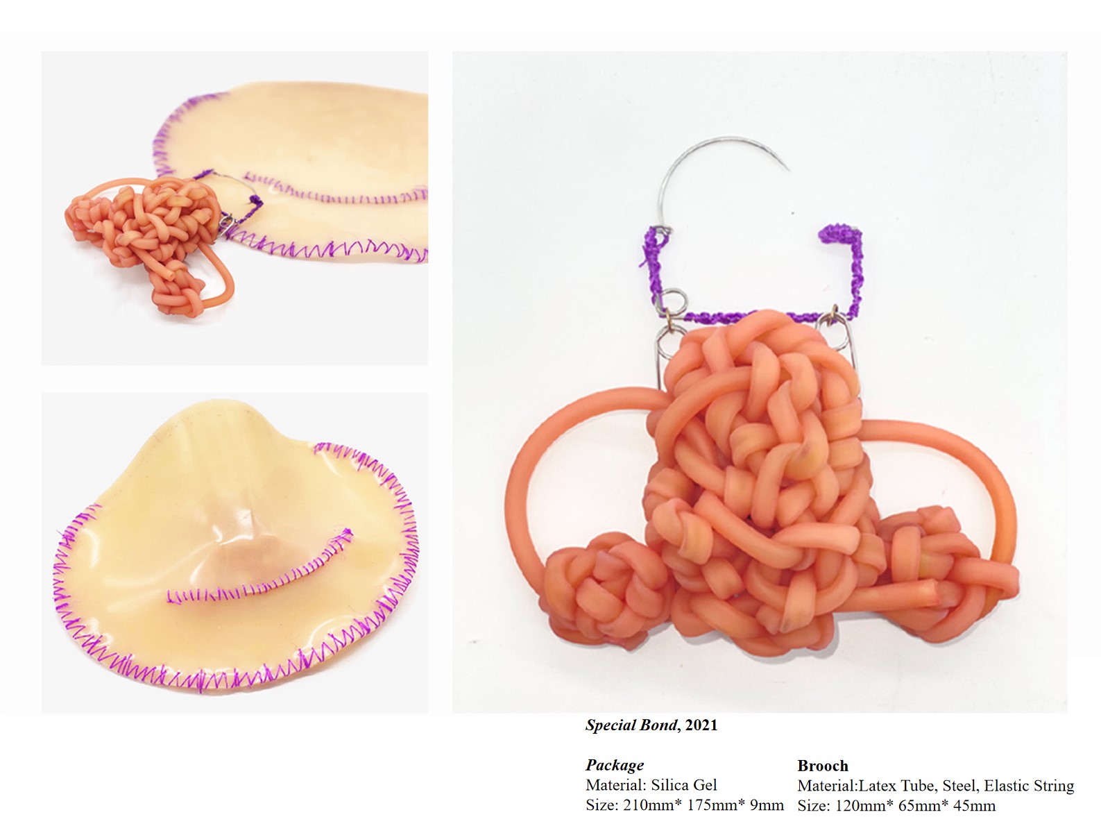 My work “Special Bond” tells a true story of what happened to me and my mother: After my mother gave birth to me in 1998, the doctors found that a surgical needle was missing, and they still did not find it even if my mother took many body checks. I gave this piece to my mother as a gift to express my gratitude to her, and I hope this brooch will help us to record this special and meaningful memory. In this work, I used some medical materials to enrich the narrative of my work.