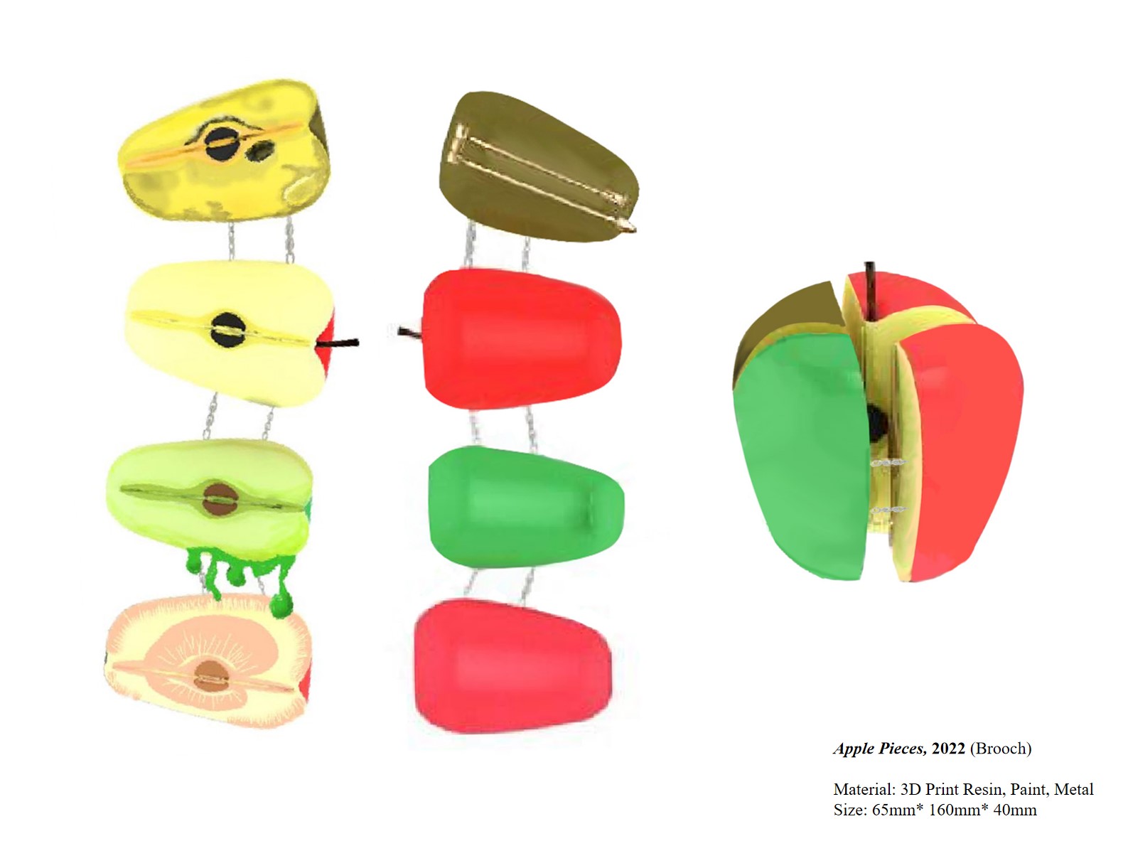 我熱愛生活并對周圍的事物總是感到好奇,所以我總是能從日常生活中發生的各種事情里獲得到一些設計靈感。《特殊連接》講述了一個發生在我和我母親身上的真實故事:在1998年我媽媽剖腹產生下我之后,醫生們發現有一根縫合針不見了,但在之后的檢查中也沒有找到這根針。我把這件作品作為禮物送給了我的母親表達對她的感謝,并希望這個胸針能幫助我們記錄下這段特殊而有意義的記憶。在這個作品中我使用了一些醫用材料來制作作品豐富作品的敘事性。《童話中的不同視角》來源于我對童話故事的重新解讀。曾經我們總是從主人公的角度理解故事、判斷正義與邪惡,卻忽視了其他角色的立場。《蘋果片》和《水晶鞋》這兩件作品分別選取了白雪公主中的蘋果以及灰姑娘中的水晶鞋作為主要元素,并用視覺呈現與材料的對比表現展示同一件物品對于不同角色的意義。