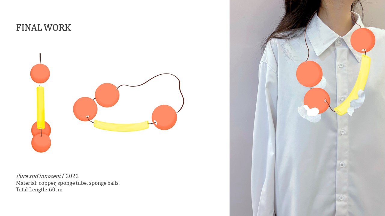 我喜歡觀察日常生活中的小事,并且每當(dāng)我看到、聽到、觸摸到一件物品我都會(huì)思考它們所具有的更廣闊的意義。在我看來,首飾似乎充滿了一種神秘的能量能夠傳遞我的感受,維系我與他人之間的情感。我試圖用一些有趣的材料和現(xiàn)成物制作首飾,以展現(xiàn)日常生活奇妙的一面。 正如我的作品《純粹與天真》,清潔海綿對我來說不僅僅只是清潔的工具。他讓我想起兒時(shí)邊洗碗邊玩泡泡的情景,象征著童年的天真快樂。所以在這件作品中我把重點(diǎn)放在身體與海綿以及泡沫的互動(dòng)上,以再造和重現(xiàn)童年稚氣的心境,也希望佩戴者能夠感受到平凡物品的美。